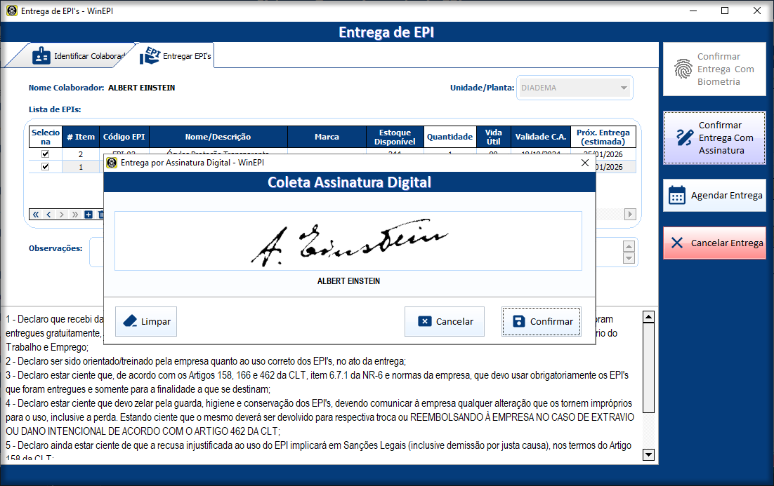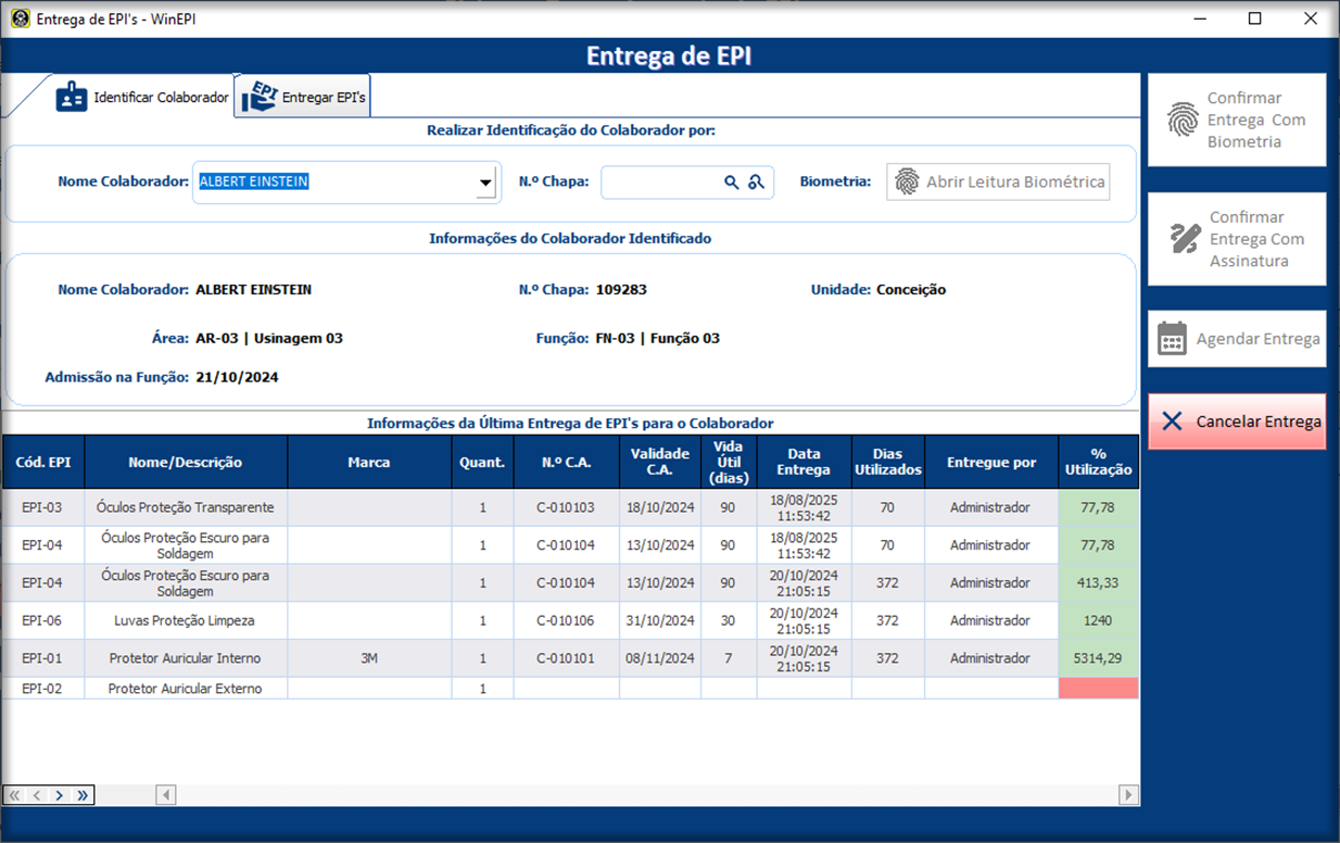 O WinEPI é um sistema para gerenciamento e controle na distribuição de EPI’s para os colaboradores através do uso de biometria bem como assinatura digital eliminando a utilização de formulários impressos em papel. O sistema agiliza a entrega dos EPI’s aos colaboradores permitindo um controle robusto e confiável através de identificação e confirmação biométrica. O sistema também permiti um controle do estoque dos EPIs monitorando e gerenciando a quantidade e gerando indicadores sobre utilização, vida útil, etc.-